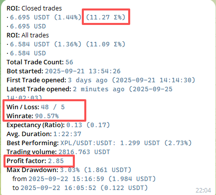 整体来看,在dry-run周期内的表现是比较稳健的,低回撤+高胜率,但收益率不算高,只能刮刮头皮,稳定滚雪球。