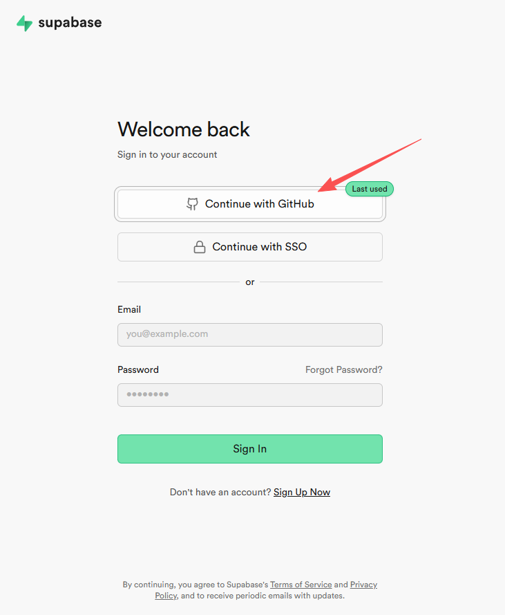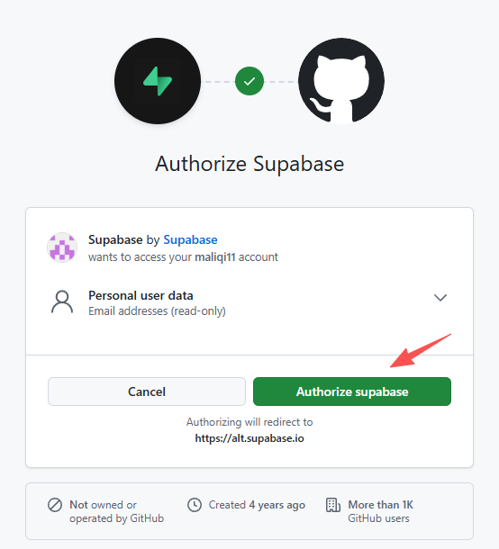 访问 https://supabase.com/signup 免费注册,也支持用github账号登录,这里我选择用github账号直接登录。