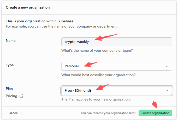 登录 Supabase 仪表盘,如果是第一次登录,会要求先新建organization,依次填写即可。