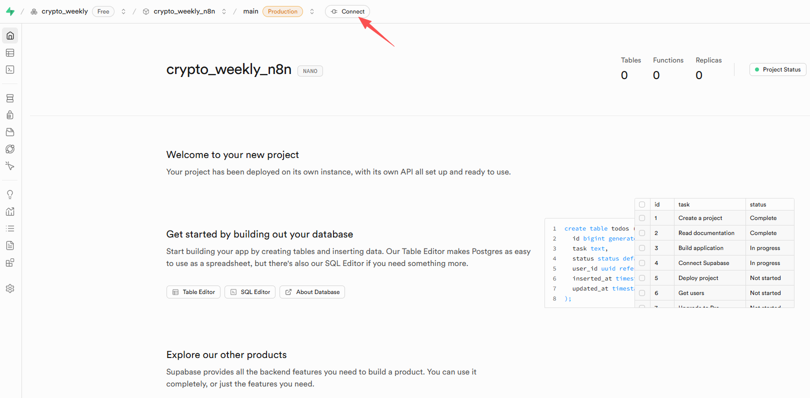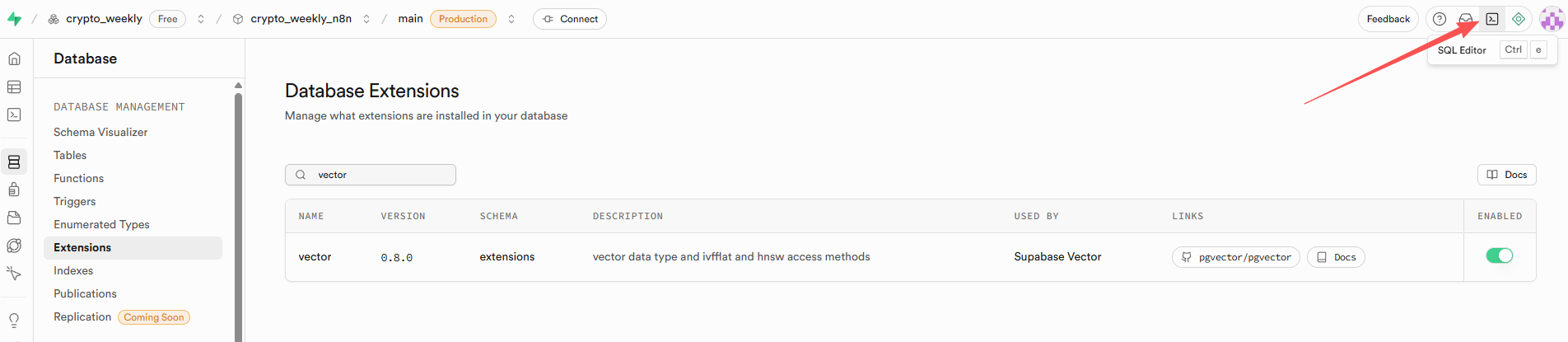 接下来可以验证一下数据库可用性,在 SQL 编辑器(Database 页面右上角的 "SQL Editor")运行以下查询: