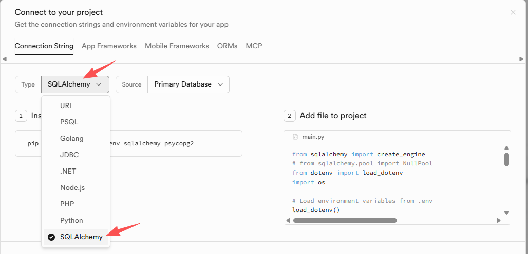 在 Connection String 区域,可以看到数据库URI(可用于 Python 一行连接),格式如 postgresql://postgres:[YOUR_PASSWORD]@db.[PROJECT_REF].supabase.co:5432/postgres。