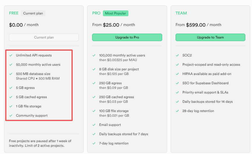 免费版的额度已经足够使用,包括免费的Postgres数据库、500M存储空间。