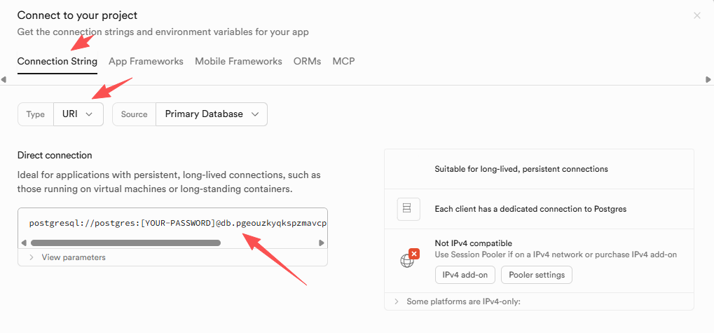 [YOUR_PASSWORD] 是你创建项目时设置的数据库密码; [PROJECT_REF] 是你的项目 ID(e.g., "abcde12345",自动填充)