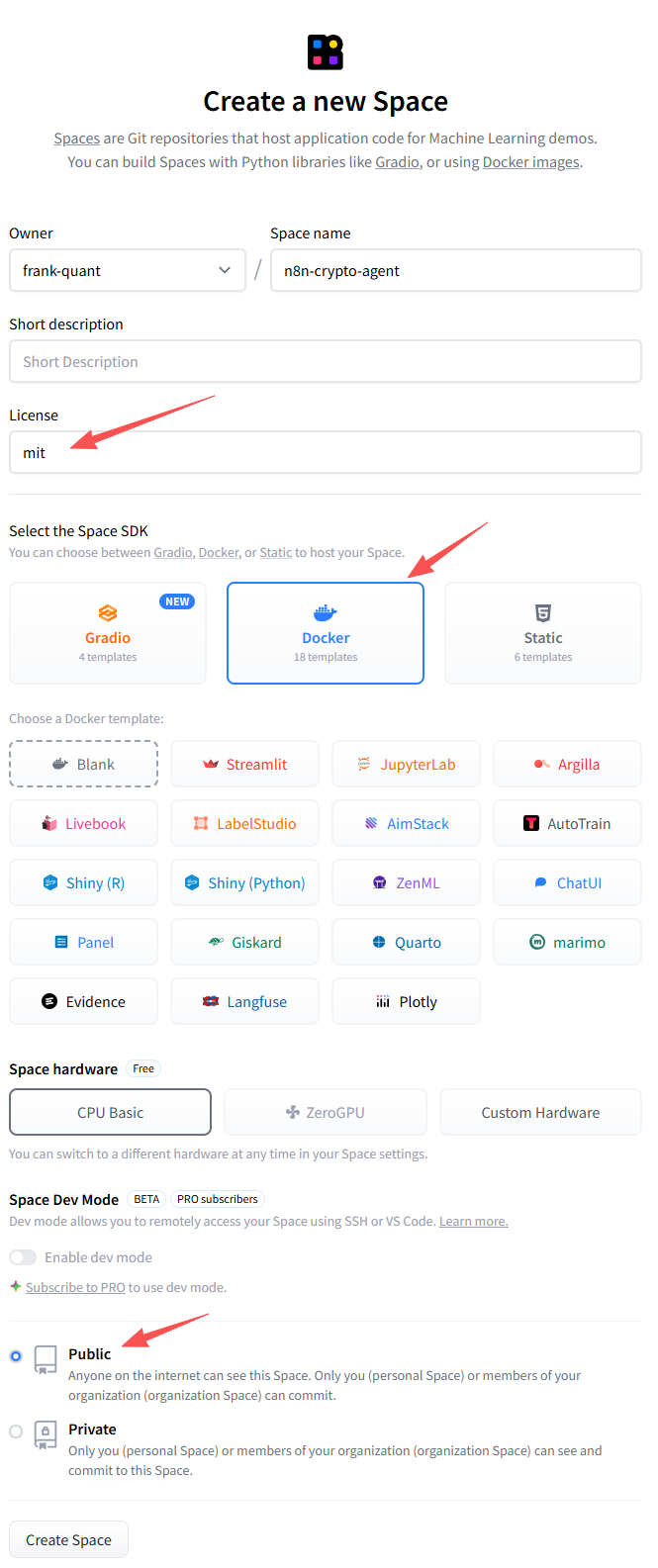设置:Name="n8n-crypto-agent",License=MIT,SDK=Docker(重要!)。