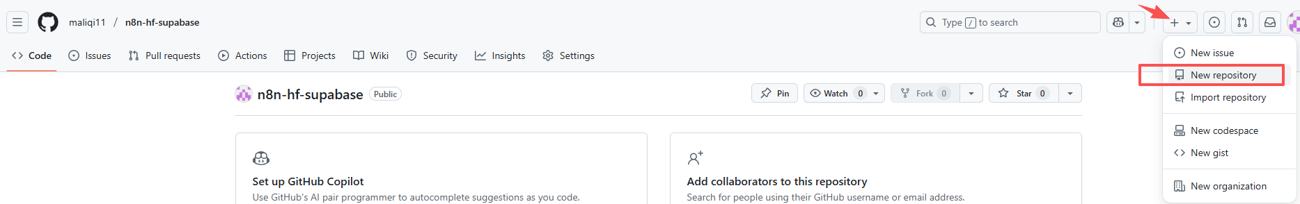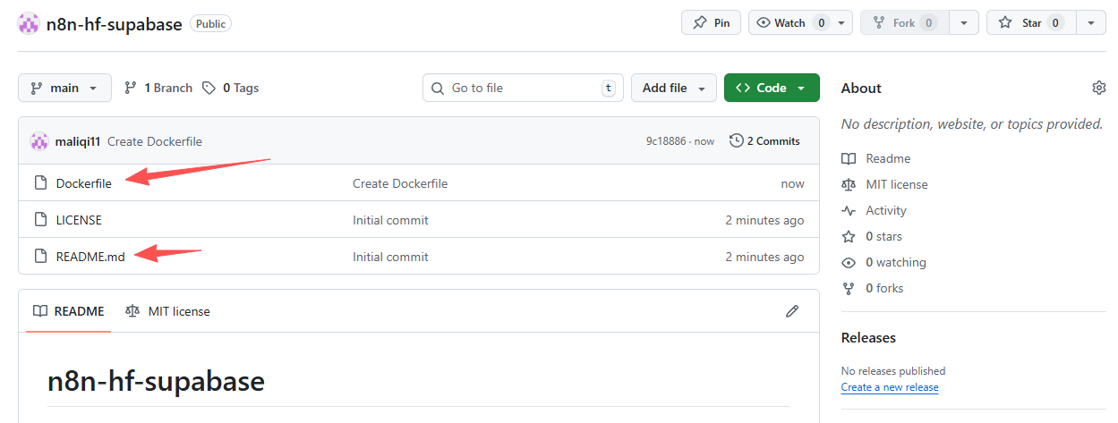 在 GitHub 新建 Repo(e.g., "n8n-hf-supabase"),网页端创建就可以。