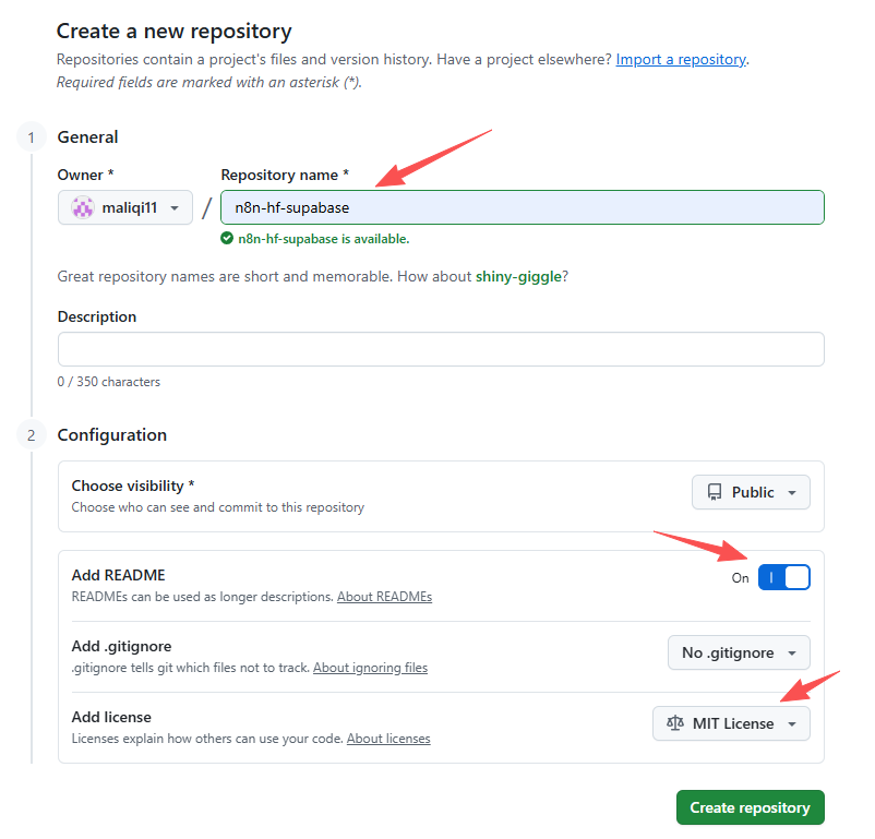 填写repo的名称,这里选用 n8n-hf-supabase