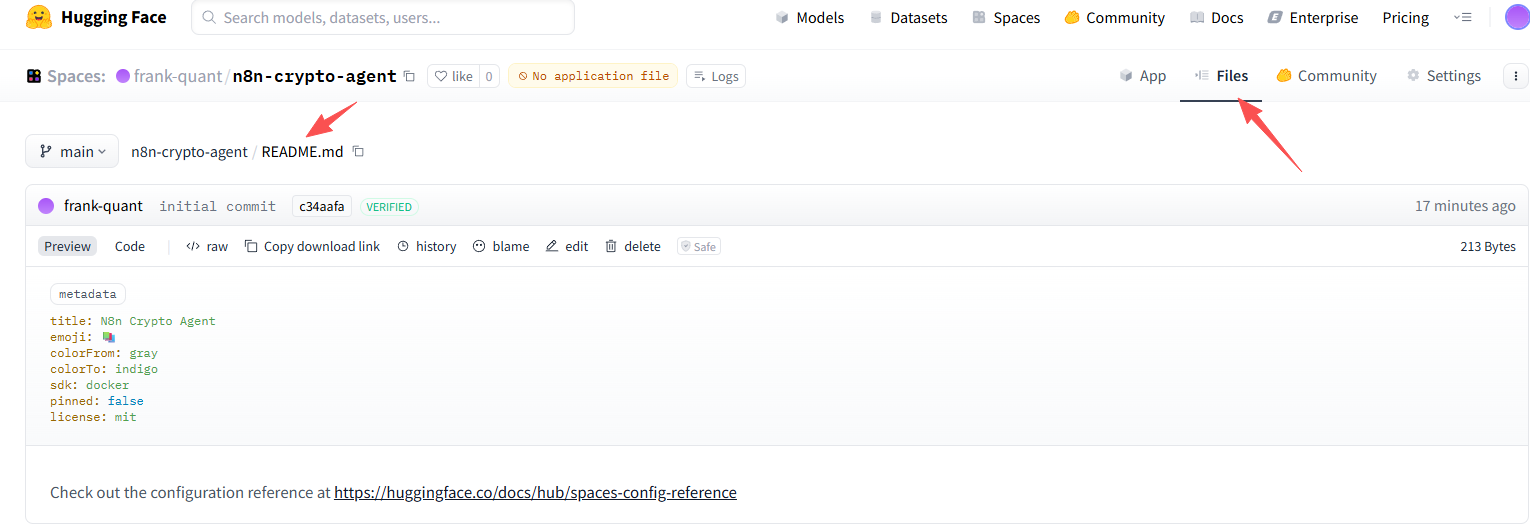 点击 Create Space,会自动生成一个新 HF Repo,并设置 README.md 的 YAML。