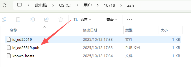 提示路径:默认 C:\Users\10718.ssh\id_ed25519(回车)。 密码:可选(空回车,无密码)。 输出:生成私钥 id_ed25519 和公钥 id_ed25519.pub。