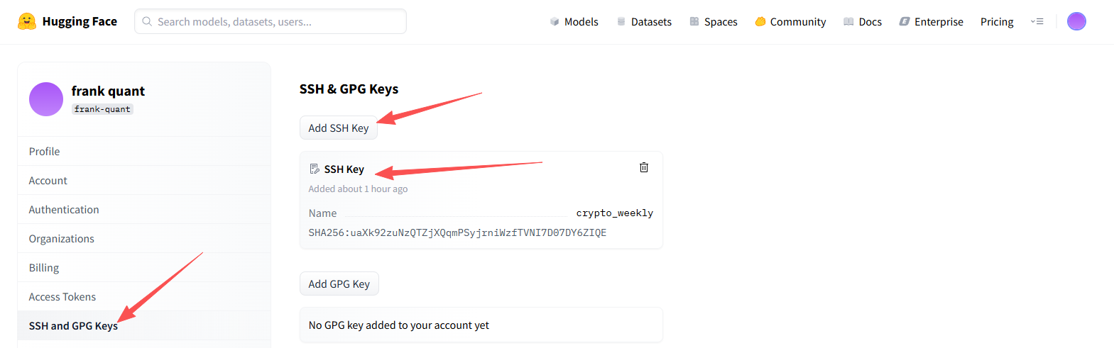 登录 https://huggingface.co/settings/keys ,添加公钥到 Hugging Face。