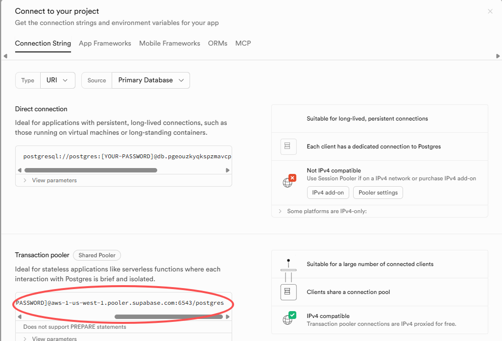 - DB_POSTGRESDB_USER=postgres.[project-ref](e.g., postgres.pgeouzkyqkspzmavcpce)