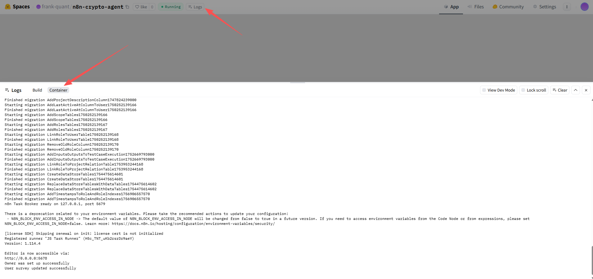 - Build 标签:构建启动(2-5 分钟,日志显示 "docker build" 过程)。成功后,访问 https://frank-quant-n8n-crypto-agent.hf.space/ 看到 n8n 界面(可能需等待构建)。