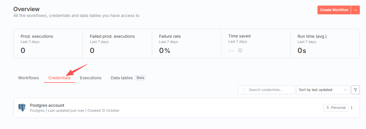 首先创建一个凭证。n8n 的数据库节点设计是先创建/选择一个 Credential(凭证),然后凭证中存储连接细节。