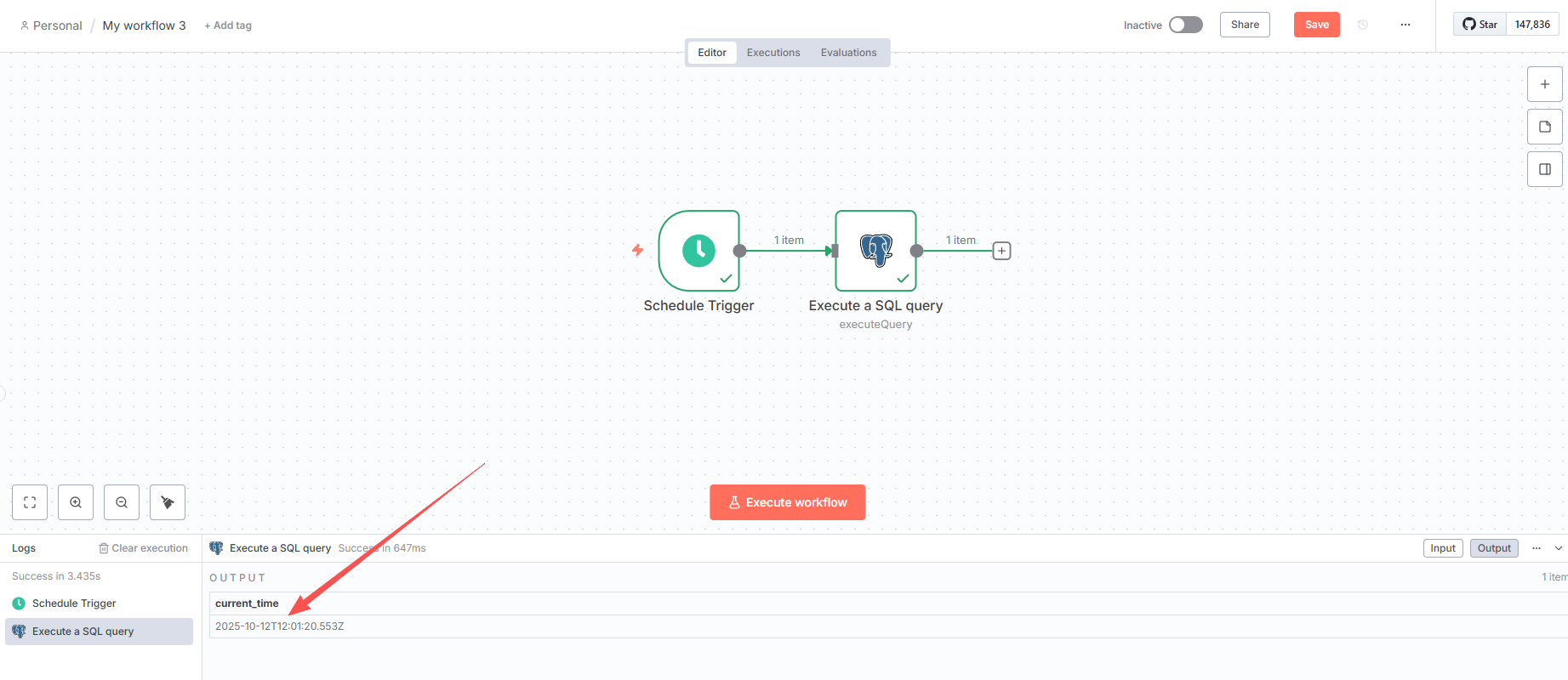- 添加 Postgres 节点(连接):操作 "Execute Query",SQL: SELECT NOW() AS current_time;。