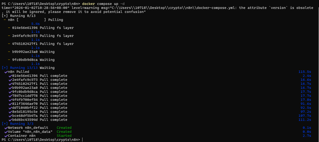 第一次运行会下载n8n镜像(几百MB,需联网),可能需要几分钟。