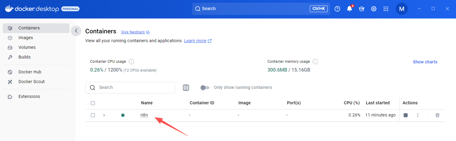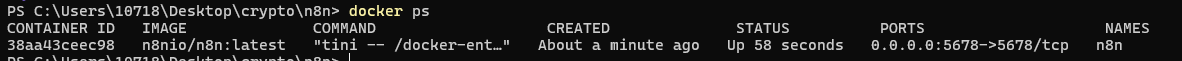 执行完成后,可以通过“docker ps”命令检查是否运行成功,可以看到一个叫 n8n 的容器在运行。
