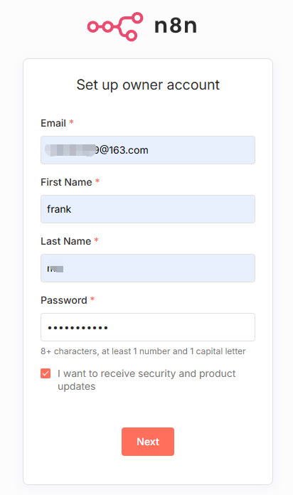 第一次访问会提示设置主账户(Owner account),填写邮箱和密码(这个是n8n内部登录密码,和上面basic auth不同)。