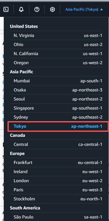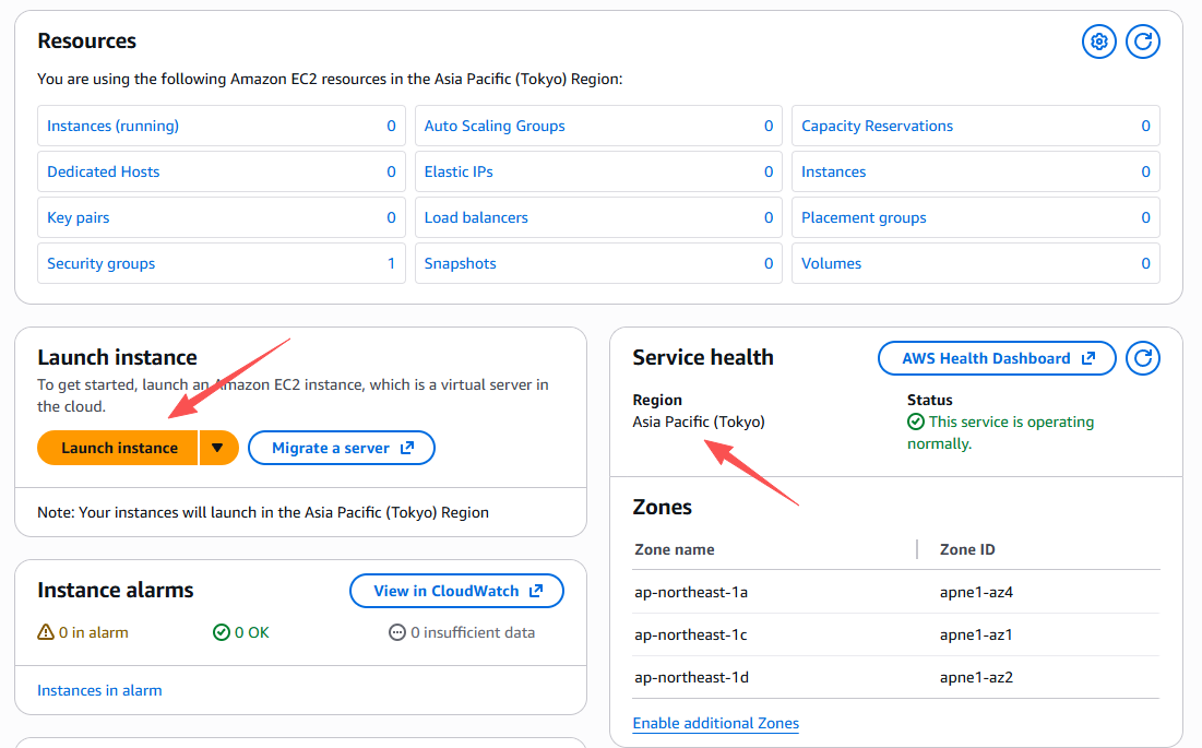 右上角选择 亚太地区-东京 (ap-northeast-1) 机房,更适合低延迟连接 Binance。