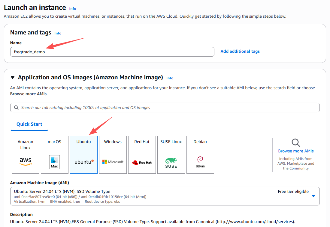 选择操作系统镜像(AMI),在“Amazon Machine Image (AMI)”部分: 选择 Quick Start > Ubuntu。 推荐 Ubuntu Server 22.04 LTS 或 24.04 LTS(64-bit x86 或 Arm,根据配置)。 右侧会显示“Free tier eligible”(免费层)标记。