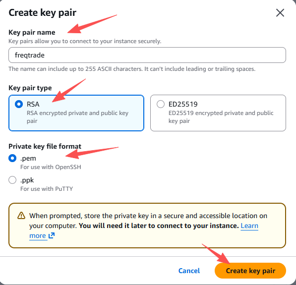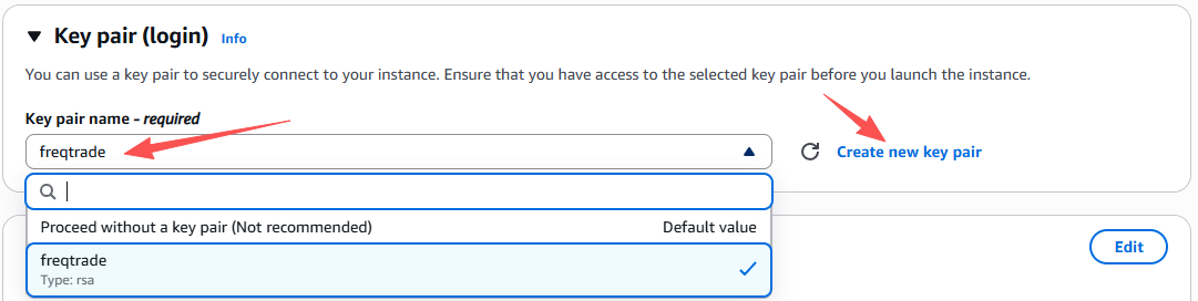 密钥对(Key pair)用于 SSH 登录,在“Key pair (login)”部分: 点击“创建新密钥对”(Create new key pair)。 名称:自定义,如 freqtrade。 类型:RSA 或 ED25519。 格式:.pem(用于 XShell)。 点击“创建密钥对”,浏览器自动下载 .pem 文件(一定要妥善保存,丢失无法找回)。