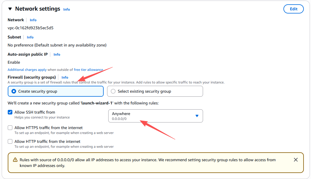 - SSH(端口 22):来源选择“Anywhere”(0.0.0.0/0,方便但稍不安全)。