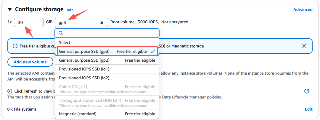 存储配置(Configure storage),选择30 GiB gp3 SSD。