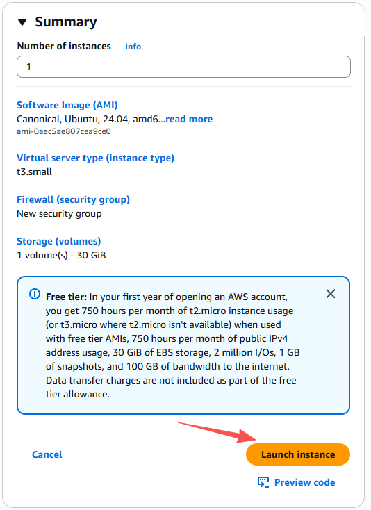 选择完后,在右侧可以看到总结详情,点击右下角“启动实例”(Launch instance)。