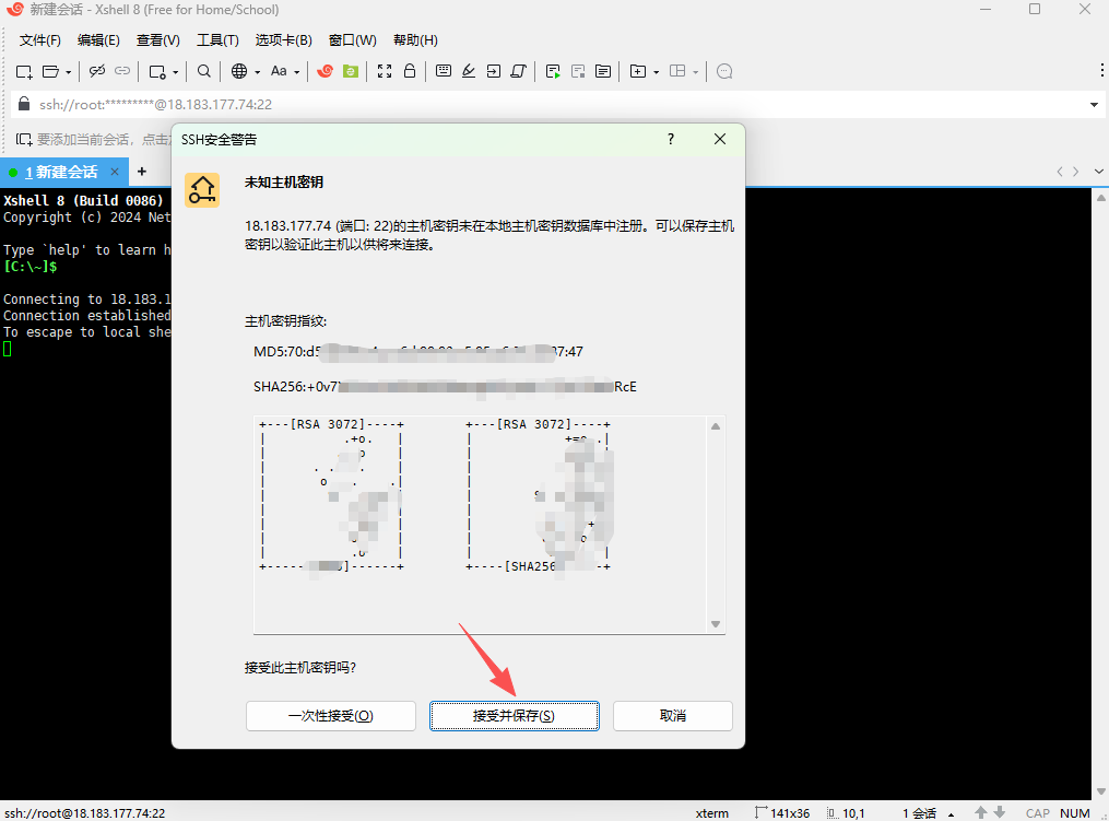首次连接会提醒是否保存主机密钥,选择接受并保存。
