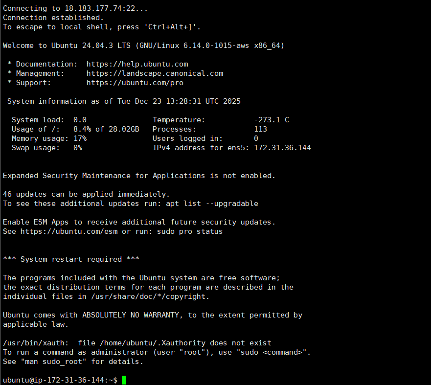 现在看到的提示“System restart required” ,这是因为 sudo apt upgrade -y 更新了内核(kernel)或其他系统核心组件,Ubuntu 建议重启来加载新版本。但在云服务器上,当前会话和运行的服务不会受影响。