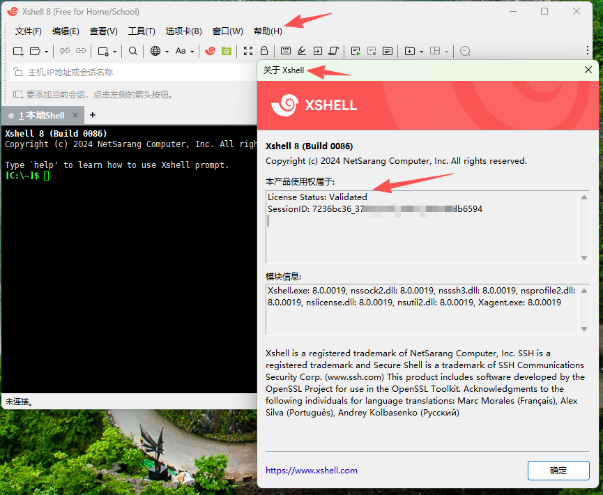 打开“帮助”下的“关于Xshell”,可以看到状态已经是 Validated。