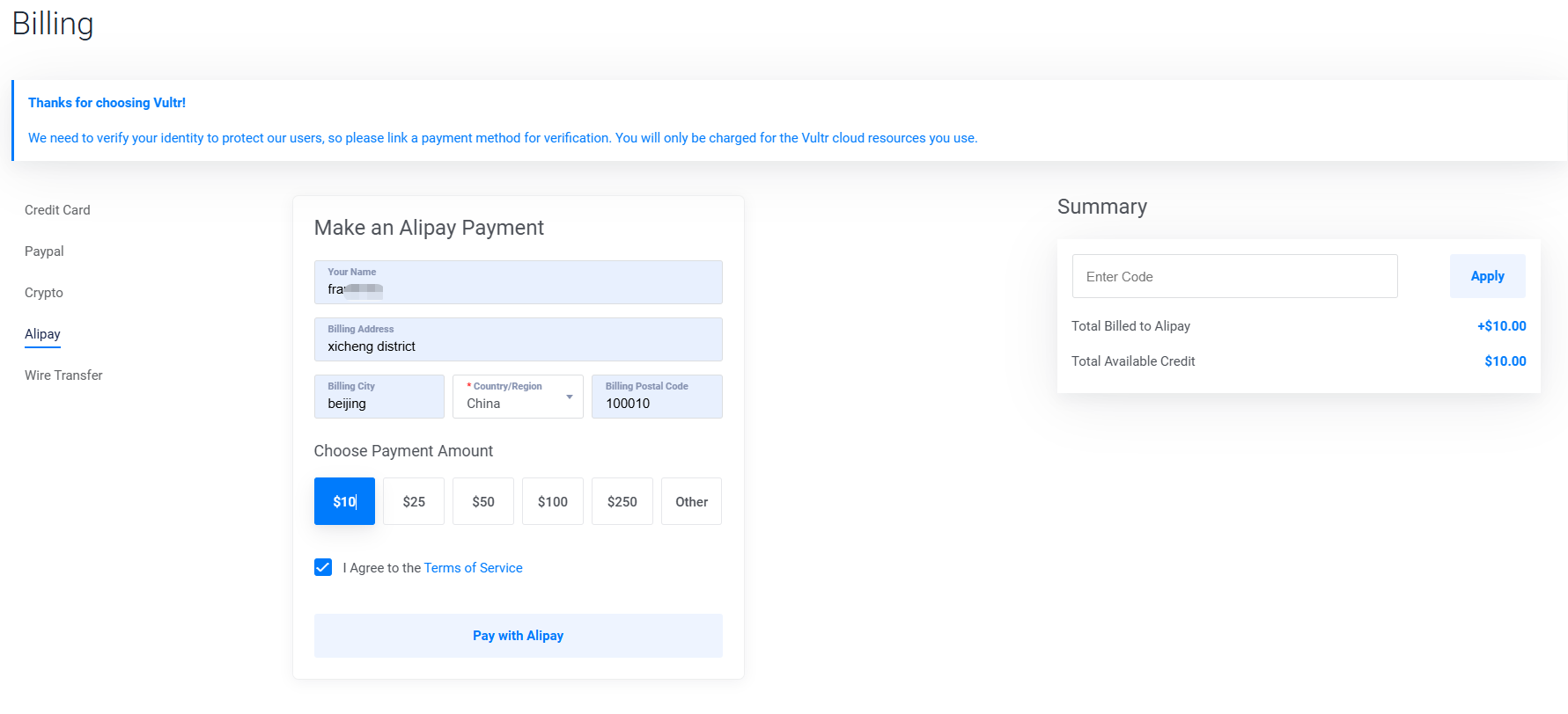 (3)登录后,进入 Billing 页面充值。最低 10 美元起充,支持支付宝、微信、信用卡。