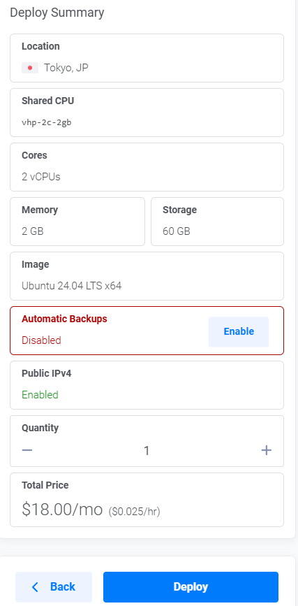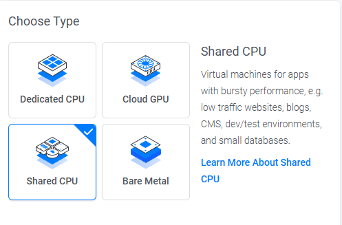 这里我先选择 Shared CPU类型试用。后续可以随时直接升级到 Dedicated CPU,操作非常简单,无需重新部署或迁移数据。要注意,只能升级,不能降级(Dedicated → Shared 不支持)。