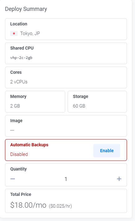 先选择2vcores+2GB规格,价格每月18美元,相比AWS便宜不少。