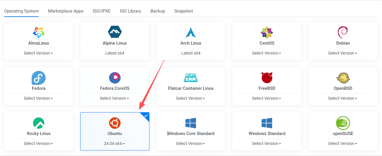 选择Ubuntu 24.04 x64(稳定),和之前在AWS中的EC2同一版本。