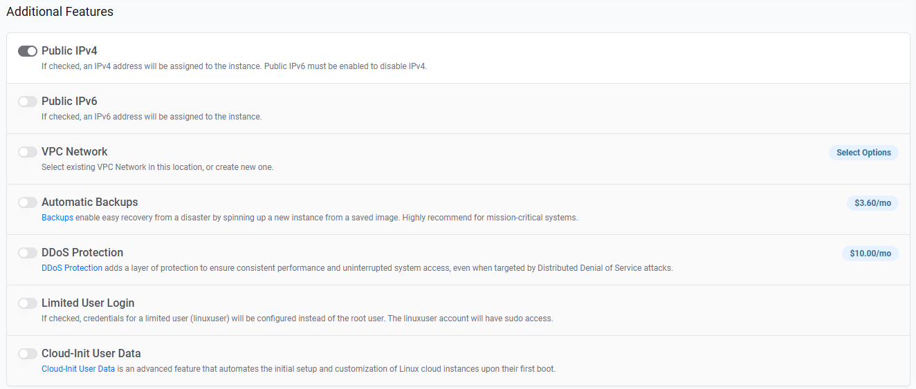 在 Vultr 部署页面,Additional Features 部分通常包含以下几个选项。