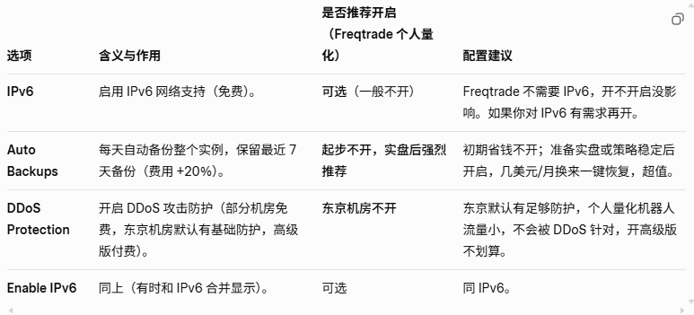 Server Hostname(服务器主机名),是实例在系统内部的主机名(hostname),登录服务器后执行 hostname 命令看到的名称。显示在 SSH 登录提示中(如 root@freqtrade-tokyo)。
