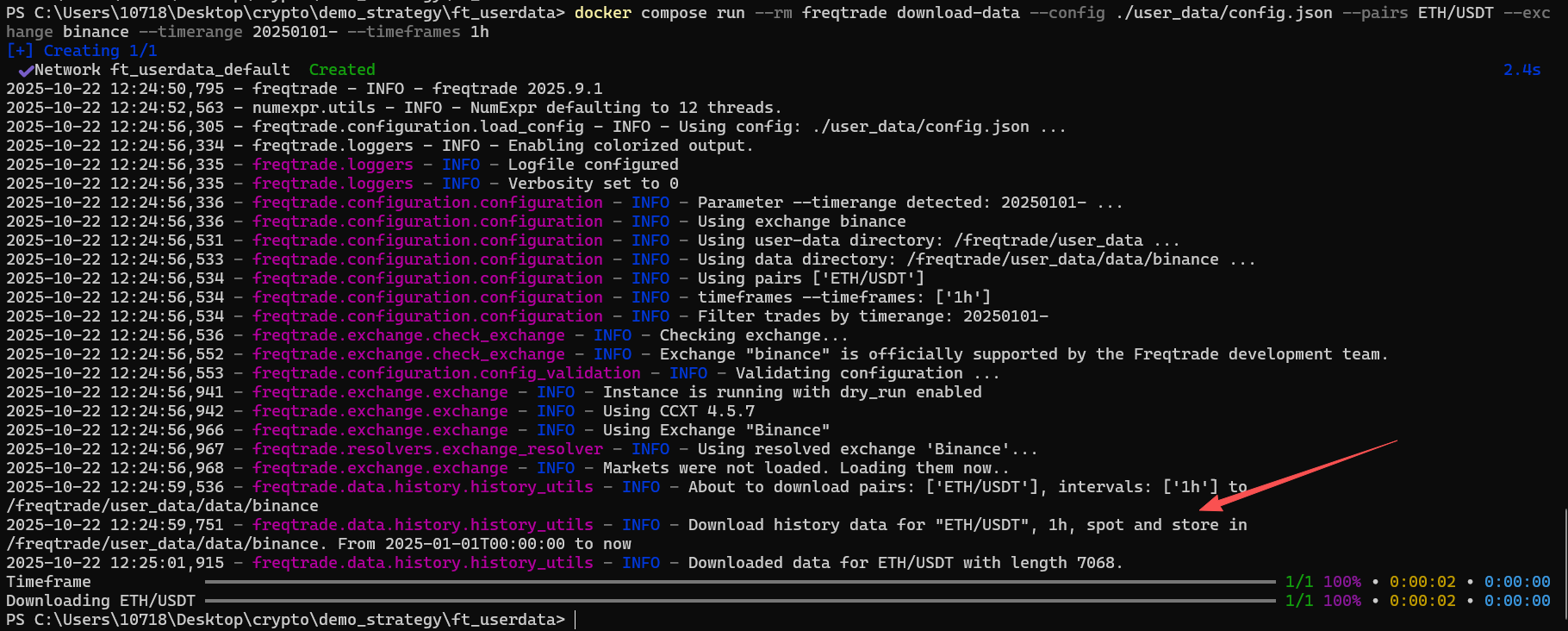 docker compose run --rm freqtrade download-data --config ./user_data/config.json --pairs ETH/USDT --exchange binance --timerange 20250101- --timeframes 1h
