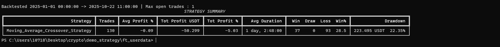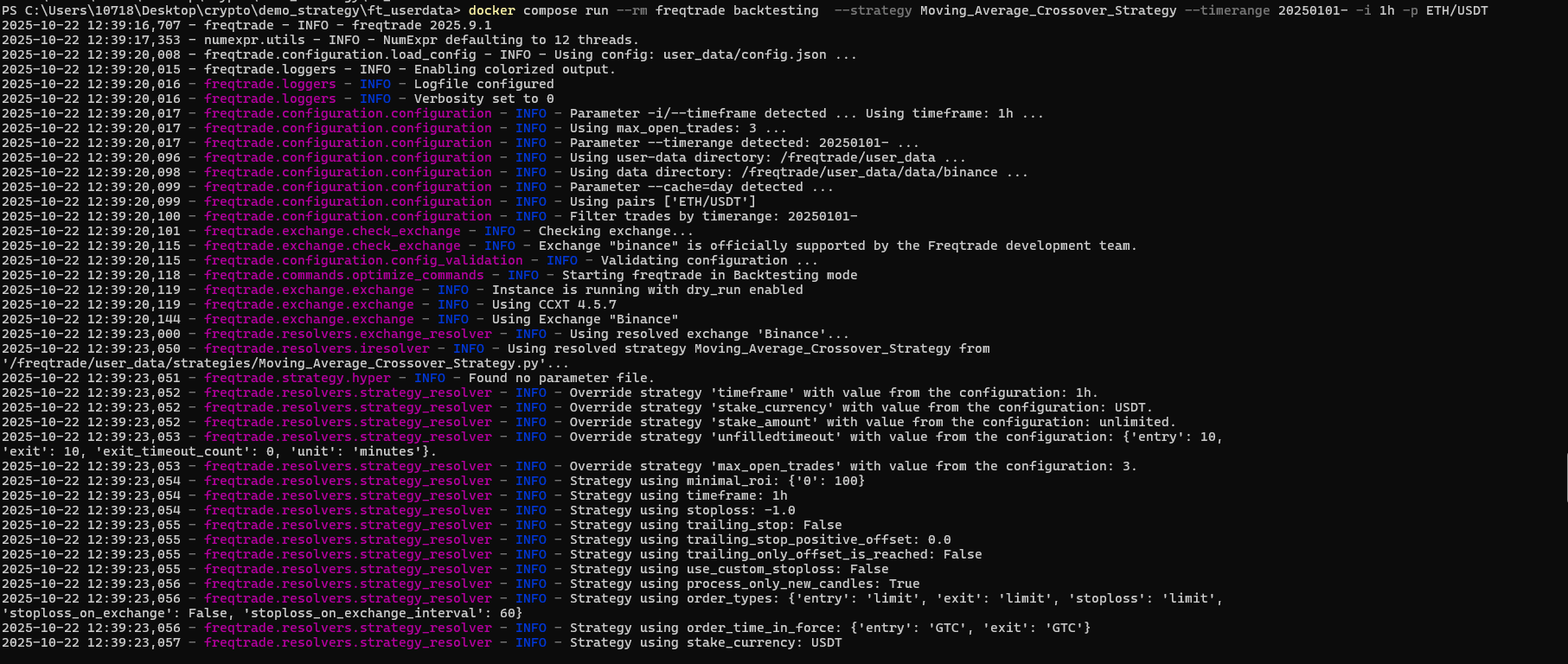 docker compose run --rm freqtrade backtesting --strategy Moving_Average_Crossover_Strategy --timerange 20250101- -i 1h -p ETH/USDT