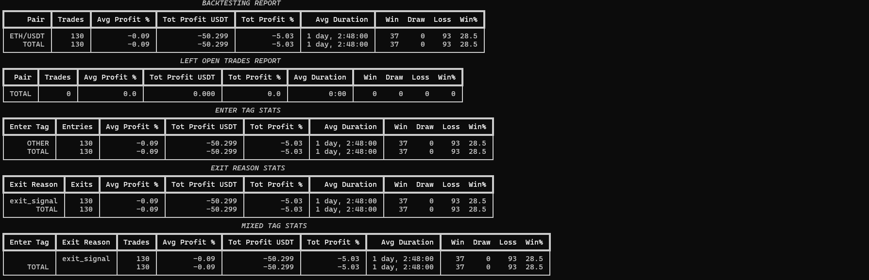 回测显示,该策略在测试期内产生了 130 笔交易,平均每笔亏损 0.09%,总亏损 5.03%。胜率仅为 28.5%(37 胜 93 亏),平均持仓时间约 1 天 2 小时 48 分钟。