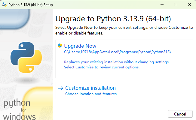 因为我已经安装了3.13版本,所以这里只是提示我要不要upgrade。