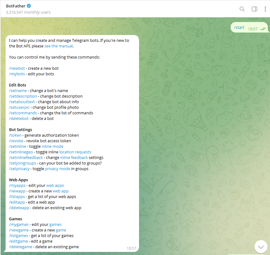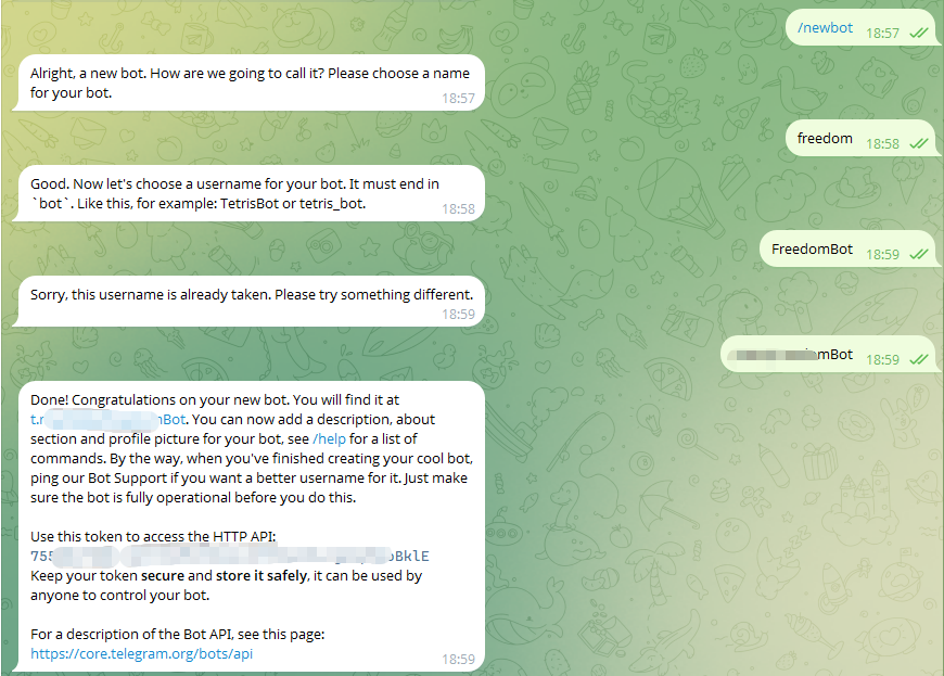 创建新 Bot:/newbot,按提示: