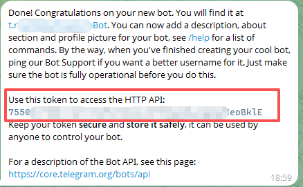 完成后,BotFather 会返回一条消息,其中包含 API Token: