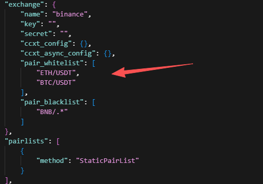 这时候要注意一下,StaticPairList 需要在配置文件中设置 pair_whitelist(交易对白名单)。