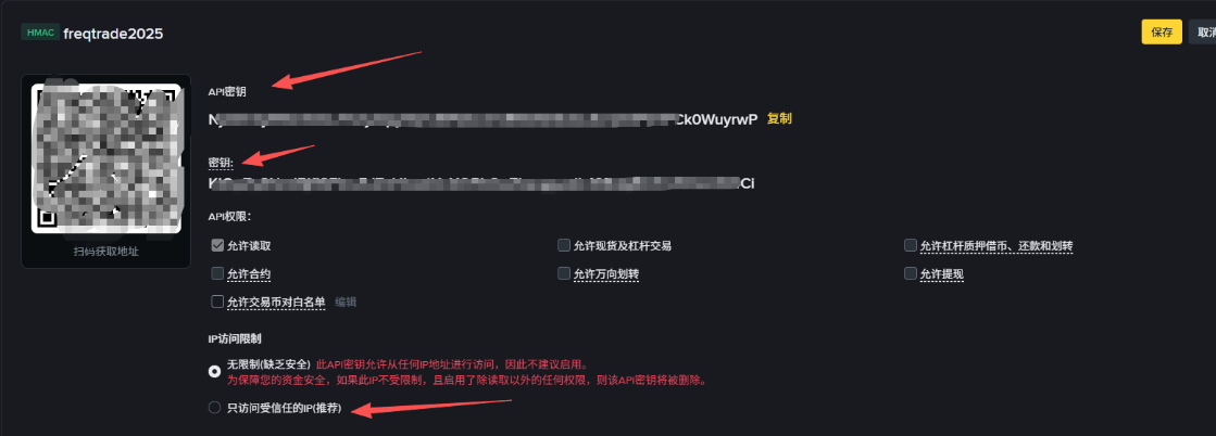 这里需要注意的是,如果要做合约交易,需要开启"允许合约",强制开启"只允许受信任的IP",也就是只在白名单的IP才能调用API。